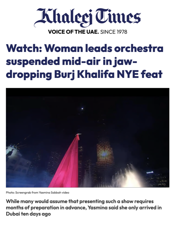 Watch: Woman leads orchestra suspended mid-air in jaw-dropping Burj Khalifa NYE feat Press Articles Jan 2 Written By Yasmina Sabbah Read the full article here. Profile Yasmina Sabbah